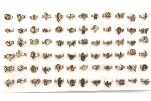 This lot includes 100 units of assorted Abalone Shell Rings. Genuine Abalone Shell. Finish: Gold Tone. Adjustable Ring Shank. Includes Ring Foam Display. Assorted styles as shown.