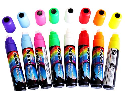 This lot includes FlashingBoards 15mm 8 Colors Fluorescent Liquid Chalk Marker Pen. These liquid chalk markers can be used on glass, windows, dry-erase boards, and other non-porous surfaces. They are NOT for use on blackboards/chalkboards. Use them to make great colourful menu board displays! They work similar to normal markers and dry quickly to become a bright solid colour. They can easily be erased. All items are brand new and ready for retail.