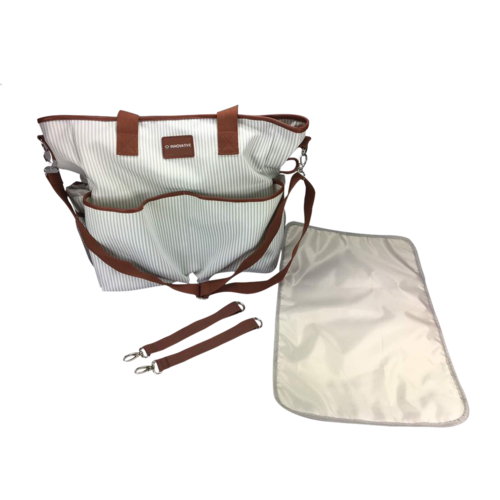 This lot contains 10 units of 2 in 1 Premium quality Diaper Bags, functional Tote with Canvas Table Top in Grey and Brown Trims from Innovative Products Portal. All items are new and retail-ready.