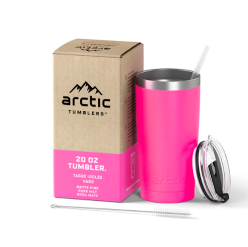This lot includes 20 oz pink stainless steel vacuum tumblers by Arctic Tumblers. Our tumblers come with a splash-resistant, straw-compatible tumbler lid; sturdy reusable straw, and handy straw cleaner. Easy to use, easy to clean, and best of all environmentally green.