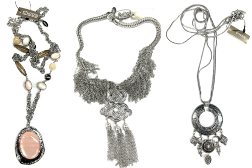 This lot includes 25 CHICO'S NECKLACES BEAUTIFUL ASSORTED STYLES. Chico all new with metal tags and string tags. All are barcoded & pre-priced. 25 Pieces All Chico's Necklaces. Over 25 Different styles. ALL new not store returns. Lots of Assorted styles much more than shown in pictures.
