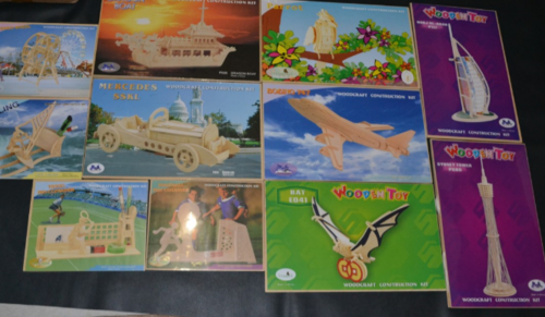 This lot includes various 3D wood puzzle sets by wood craft construction. All of the items are new and in assorted styles.