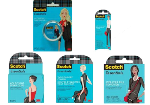 This lot features 100 pieces of 3M Scotch Essentials items. The lot holds 20 pieces of each item total 100 pieces. This lot includes Sweater Pill Remover, Accessory Tape Circles, Tag Comfort Covers, Easy Fix Button, and Hold Tight Strap Clips. All items are new and retail-ready.