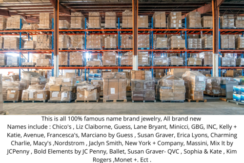 This is all 100% famous name brand jewellery, all brand new!! Some Names include Chico's, Liz Claiborne, Guess, Lane Bryant, Minicci, INC, Kelly + Katie, Francesca's, Erica Lyons, Charming Charlie, Massini, Style& Co, A&I, Mix It by JCPenny, Bold Elements by JC Penny, Ballet, Susan Graver- QVC, Monet, Dressbarn & The limited Ect. A great assortment includes necklaces, earrings and bracelets. All jewellery is new with retail price and Bar Coded