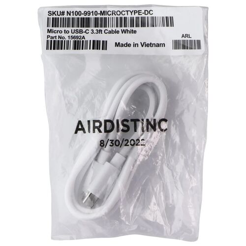 This lot includes New in bag 100 units of AIRDISTINC (3.3 Foot) Micro to USB-C Charging Cable in White. Features: 3.3-foot length for flexible connectivity, Fast and efficient charging, High-quality materials for durability, and Sleek white colour for a modern look.