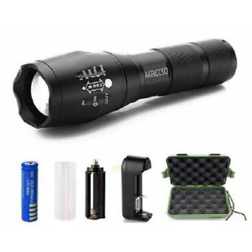 This lot includes AKRICCSO Super Bright LED Tactical Flashlights. 1,000 Lumen Bright Light High Powered Flashlight is made of aluminium alloy and 30% brighter than other versions. 5 LIGHT SWITCH MODE: Full Brightness, Medium Brightness, Low Brightness, Strobe Brightness, and SOS. ADJUSTABLE FOCUS: The tactical flashlight can be adjusted from a small spotlight effect to a very large area, just by pulling back on the cylinder of the flashlight. OUTSTANDING DESIGN: Water resistant, anti-abrasive, skid proof, compact design makes it the top pocket flashlight for outdoor activities, camping, hiking, fishing, home use, as a powerful emergency light. Box Includes 1 x Ultra Bright, Zoomable, Adjustable Focus XML T6 Tactical LED Flashlight 1,000 Lumen, 1 x AAA Battery Holder, 1 x Lithium Battery Charger (Input: AC100-240V), 1 x 18650 Rechargeable Lithium-Ion Battery (3.7V 1800mAh), 1 x Gift Case, and 1 x User Manual. All items are brand new and ready for retail.