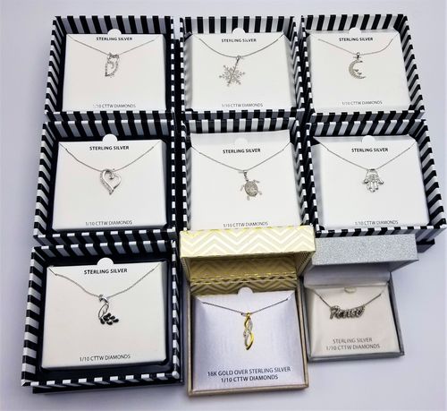 This lot contains 45 Sterling Silver and 1/10 CTTW Marsala Mfg. 18" Necklaces and also contains 6 Nine West Watches and 1 Anne Klein Watch. A few of the necklaces do not have boxes and some of the watch boxes are damaged. All items are new and retail-ready.