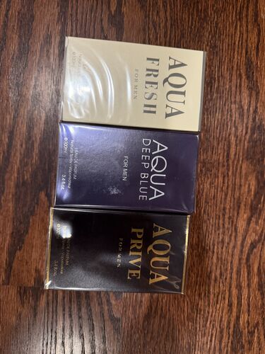 This lot includes Aqua for Men Perfumes 3.4 OZ. Inventory: Aqua Fresh - 15, Aqua Deep Blue - 15, and Aqua Prive - 15.