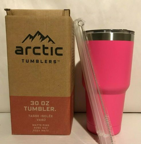 This lot includes 30 oz. Tumblers by Arctic Tumbler. Breast Cancer Pink Arctic Tumblers. Stainless Steel Vacuum Tumblers Pink. EXTREME TEMPERATURE RETENTION - The Arctic Tumblers double-wall vacuum technology maximizes temperature retention that traps the cold in your beverages for 24 hours and the heat for up to 12 hours! The thermal insulated design keeps the flavour and freshness of your drink while preventing any temperature transfer to the exterior. No matter what the contents - hot tea, coffee, or an ice-cold beverage, the feel on this stainless vacuum tumbler remain constant! CUP HOLDER FRIENDLY.