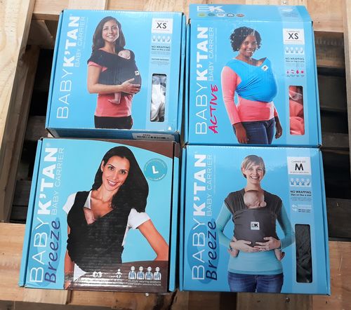 This lot contains 214 units of various Baby K'tan Baby Carriers. These items range in size from XXS to XL and come in a few different colours. Most of the units are the 'original' type Baby K'tan, but there are also some of the 'breeze' version, as well as the 'active' version. Packaging will vary, and boxes may have some damage. All items are in used condition.