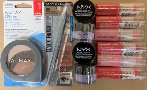 This lot includes Assorted Cosmetics by Maybelline, Almay, and NYX. The lot holds Maybelline Tattoo Studio Liner Sparkling Silver, Almay Intense i-Color Eye Shadow Blue, NYX Concealer Lavender, and NYC Showtime Lip Balm Modern Coral. All items are brand new and ready for retail. See the manifest for products breakdown.