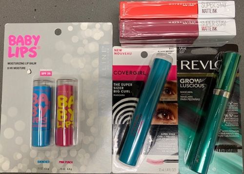 This lot includes Maybelline Super Stay Matte lnk Artist/Heroine, Revlon Mascara Black, Covergirl Mascara Black/Brown, and Maybelline Baby Lips Quenched/Pink Punch. All items are brand new and ready for retail.