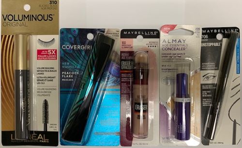 This lot features L'Oreal Mascara Blackest Black, Covergirl Mascara Intense Black, Maybelline Eraser Age Rewind Eraser Medium, Almay Concealer Light/Medium and Maybelline Unstoppable Automatic Pencil Pewter. All items are brand new and ready for retail.