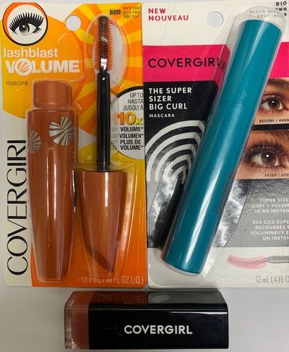 This lot contains Covergirl Lashblast Volume Mascara Very Black, Covergirl The Super Sizer Big Curl Mascara Black Brown, and Covergirl Lip Stick Romance Mauve. All items are brand new and ready for retail. See the manifest for products breakdown.