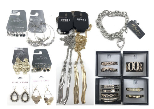 This lot includes 50 pieces of Designer Brand Jewellery. All Jewelry is individually Packed or Boxed. Every piece is barcoded with Retail Price. Some Brands include: Guess, Land Bryant, Minicci, CBG, INC, Kelly & Katie, Anemue, Francescas, Marciano etc