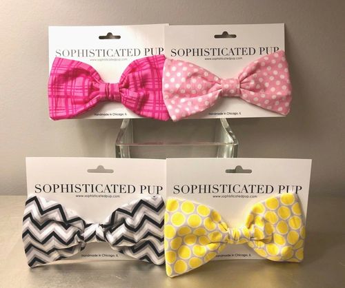 This lot includes 302 pcs of Assorted Dogs Bow Ties from Sophisticated Pup in Assorted Sizes and Colours. Boutique quality, handmade in the USA - retail ready! The bow ties are individually packaged on a retail-ready hanging card. This is a great way to stock a boutique for a small fraction of the price! Big profits for your store with these designer, high quality products. ***The harness on the dog in the picture is not included in this listing.***