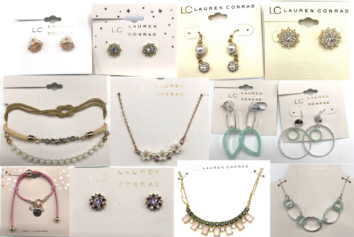 This lot includes 100 pcs of Lauren Conrad Earrings, Necklaces & Bracelets. All jewellery is new and individually packaged all with Pre Priced $12.00 to $20.00 each and Bar Coded. Over 100 different styles
