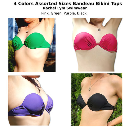 This lot includes 110 Brand New Assorted Sizes & Colors Bikini Tops Padded Push-up Bandeau. Brand: Rachel Lym Swimwear. Manufactured: China. Designed: USA. Colors: Solid Pink, Purple, Green, & Black w/ White Interiors. HCBT Bandeau, single back tie, Underwire, Padded, Hand wash only, ruffle front. Provided are ORIGINAL PHOTO EXAMPLES of items on OUR model and mannequin. Items are EXACTLY as you shall receive them. Resale Ready. MSRP varies, can go as high as $50.00 a piece. Can be used as a strapless lingerie piece with strapless dresses or boost/shaping with regular attire.