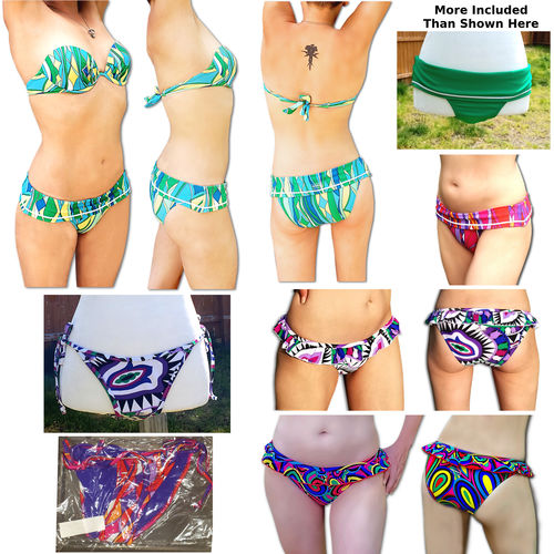 This lot includes 56 Brand New Assorted Style Size Color - BIKINI BOTTOMS - AB Green Bikini Tops. TWO PARCEL SHIPMENT, BOTTOMS IN ONE, 8 TOPS IN SECOND BOX. Brand: Rachel Lym Swimwear. Manufactured: China. Designed: USA. Colours: Abstract Pink, Abstract Green, Colorful Teardrop, Mosaic Tile Print, Green. Style: BFOB - Bikini Bottom Flat w/ White Stripe Fold Down Band, BMSB - Bikini Bottom Frilled Hanging Fringe Cheeky Sporty, RSTB - Bikini Bottom Side Tie String Classic Adjustable Fit. HCBT - Bandeau, single back tie, Underwire, Padded, ruffle front. ORIGINAL PHOTO EXAMPLES. SEE MANIFEST FOR COLORS PROVIDED. Resale Ready.