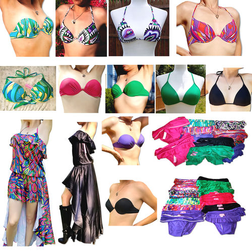 This lot includes 129 LIKE NEW / SHELF PULL Assorted Style Size Color Bikini Bottoms & Tops by Rachel Lym. ONLY "DEFECTS" ARE SPECIFICALLY ON THE HANGING TAGS - MARKDOWN WRITING. Online business liquidation items, most have never been worn OR handled by public. Includes all tags and interior sanitary strips intact. Brand: Rachel Lym Swimwear. Manufactured: China. Designed: USA. Styles Included: BFOB - Bikini Bottom Flat w/ White Stripe Fold Down Band, BMSB - Bikini Bottom Frilled Hanging Fringe Cheeky Sporty. HCUH - Wired Double Tie Bikini Top, HCBT - Strapless Single Tie Padded Wired Bandeau Top, HCST - Soft Padded Double Tie Unwired Top, ORIGINAL PHOTO EXAMPLES. SEE MANIFEST FOR COLORS PROVIDED. Resale Ready.
