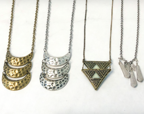 This lot includes Beautiful trendy tribal necklaces! These simple and chic accessories are a must-have for a fashionista like you! Grab these as a treat for yourself or someone special. YOU WILL GET 35 TOTAL NECKLACES. (5 Necklaces of each style) with the original packaging. 7 different styles: Sierra - (silver ox and brass ox finishes) - Beautiful crescent style pendant on an 18" chain with extender, Taylor - Triangle shaped pendant on a 24-inch chain with extender, Hailey - Triangle shaped pendant on a 24-inch chain with extender, Daniella - (silver ox and brass ox finishes) -Charms style pendant on an 18" chain with extender, Kyra - (brass ox finish) Ladder style geometric pattern pendant on an 18" chain with extender.