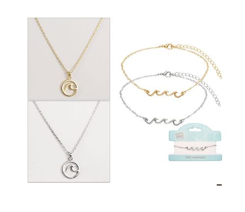 This lot includes 48 assorted wave necklaces and bracelets. New and retail packs. Wave Necklaces - 24 Pieces Unit and Multi-Wave Bracelets - 24 Pieces Unit.