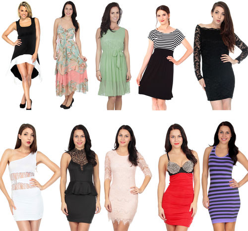 This lot includes Women's Sexy Sleeveless High-low Party Dress in Black colour, V-Neck Boho Long Dress with Empire Waist and Floral Print, dainty chiffon sundress w/ pleated skirt and matching the sash, Women's Maternity Summer Baby Shower Dress Short Sleeves, Blk/White, Women Striped Summer Mini Tank Dress, Lavender, One Size, Sexy Bodycon One Shoulder Floral Lace Mini Slim Dress Clubwear, White, Off Shoulder Lace Dress with Long Sheer Sleeves, Stretch Fit, Black S, Classy Party Dress in Soft, Delicate Peacock Lace, Sexy Rocker Dress w/ Deep V Neck & Spike Accents Ruched, and Women's Lace Neck Sleeveless Open Back Night Club Bodycon Black Dress. See the manifest for products breakdown.