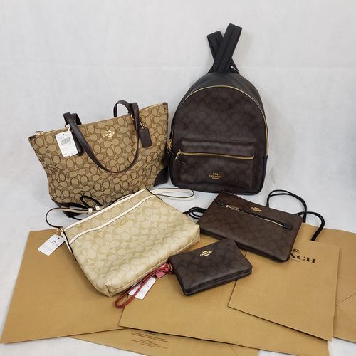 This lot includes 5 items of Authentic Coach Handbags such as Backpack, Tote Bag, Crossbody and Wristlets. All items are new with tags and retail-ready. Papers bags are included.