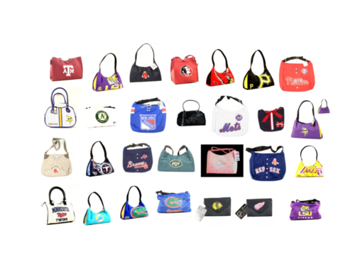 This lot includes 24 New with tags Authentic Sports Teams Ladies Purses/Bags/Wallets as shown. NCAA, MLB, NFL, NHL, AND MOST COLLEGE TEAMS