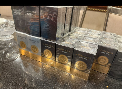 This lot includes Azura Noir Perfume for Men 3.4 Oz. Azura Noir intense 20 pcs, Azura Noir for men 14 pcs, and Azura Noir after dark 14 pcs.