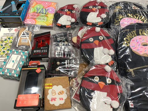 This lot contains a mix of General Merchandise like Shoulder Bags, Backpacks, Journals, Jewellery, Earbuds, Batteries, and More from Ridleys Games, Celebrate Shop, Sharper Image, Bow Drape, Betsey Johnson, and More. These are brand new shelf pulls from a famous dept store and ready for retail.