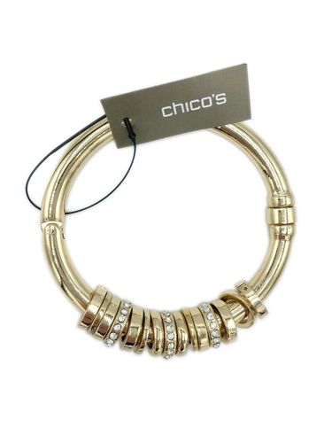 25 Pieces Beautiful Chico's Bangle Bracelets Brand New. Ideal for reselling in your store or online. CRYSTAL STONES, Finish: Gold Tone all polished, High Quality, All will have Chico tags. Each piece is individually bagged.