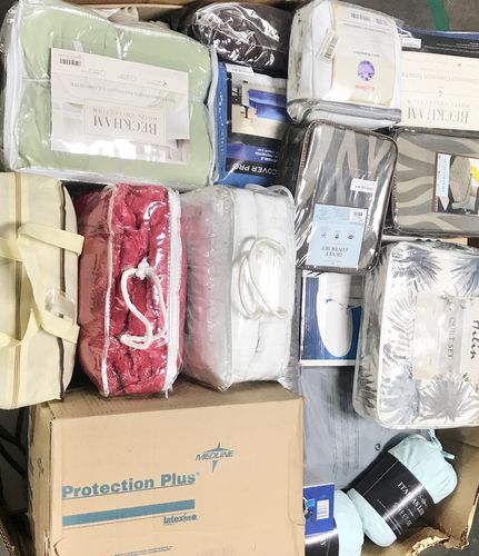 This lot includes bedding, bath accessories, and more home goods by Beckham Hotel, Fanmats, Northwest, Safdie, Baby Doll Bedding, and many more. See the manifest for inventory breakdown.