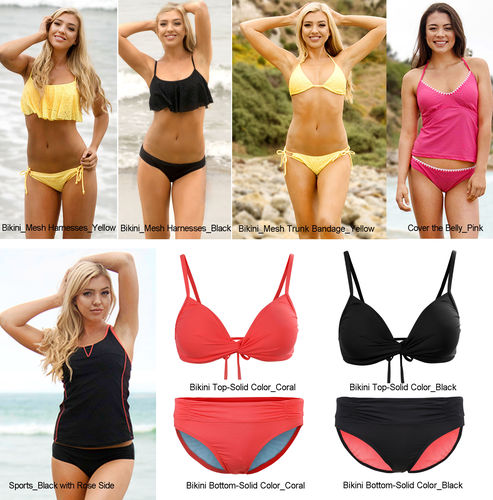 This lot includes a Bikini Set Tankini Swimsuit. Solid Color: Material: 80%Nylon+20%Spandex, S: Chest: Adjustable, Minimum 23.5" Waist: 29.0"-32", M: Chest: Adjustable, Minimum 24.5" Waist: 31.5"-36", L: Chest: Adjustable, Minimum 25.0" Waist: 34.0"-39", XL:Chest: Adjustable, Minimum 26.0" Waist: 37.0"-41". Bikini_Mesh Trunk Bandage: Material: Shell: 92% Nylon+8% Spandex; Lining: 80% Nylon+20% Spandex; 100% Polyester, Size XS: Chest: Adjustable Waist:23", Size S: Chest: Adjustable Waist:25", Size M: Chest: Adjustable Waist:27", Size L: Chest: Adjustable Waist:29". Bikini_Mesh Harnesses: Material: Shell: 92% Nylon+8% Spandex; Lining: 80%Nylon+20% Spandex; 100% Polyester, XS: Chest: 20.5" Waist: 23", S: Chest: 22.5" Waist: 25", M: Chest: 24.5" Waist: 27", L: Chest: 27.0" Waist: 29", XL: Chest: 29.5" Waist: 32". Swimwear_Cover the Belly: Material: Shell: 80% Nylon+20% Spandex; Lining: 100% Polyester, Size XS: Chest: 27" Waist: 27" Hip: 28".
