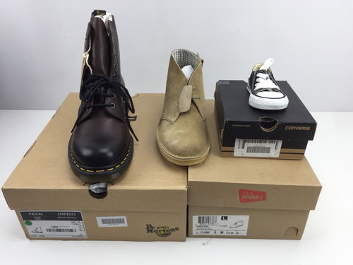 This lot comprises shoes from Franco Sarto, Doc Martens, Birkenstock, and more. All of the items are in new condition.