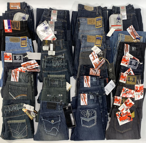 This lot includes 25 units of New with Tags Boy's Assorted Fashion Denim Jeans. Assorted Brands, Sizes and Washes. See the manifest for sizes breakdown.