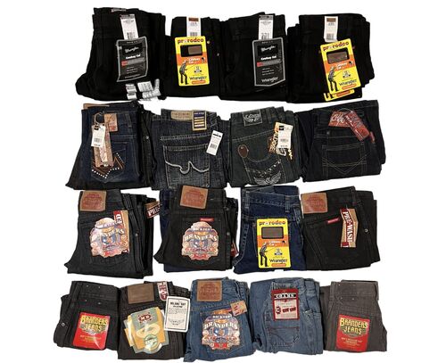 This lot includes 25 units of New with Tags Boy's Assorted Colors and Sizes of Jeans from Dickies, Wrangler, Caldore, Eddie Domani, Chams, and Milano Bay. See the manifest for the exact inventory Sizes breakdown.