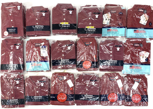This lot includes 52 units of New with Tags Boy's Assorted Polo Shirts in Burgundy Colour and Assorted Sizes. Sizes included are 4, 5, 6, 7, 8, 10, 12, 14, 16, 18 & 20. Brands included: French Toast, School Uniform.