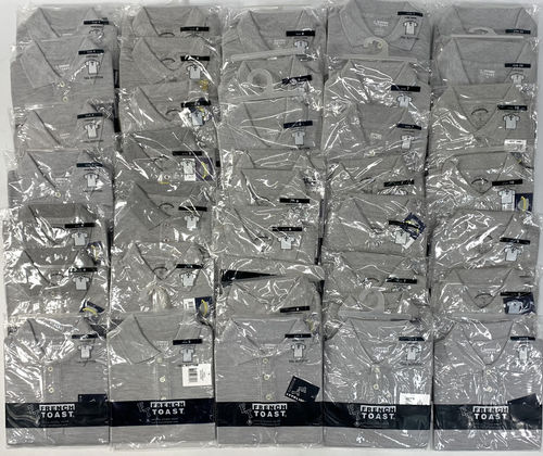 This lot includes 44 units of New with Tags Boy's Assorted Polo Shirts in Gray Colour and Assorted Sizes. Sizes included are 4, 5, 6, 7, 8, 10 & 20. Brands included: French Toast, School Uniform.