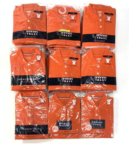 This lot includes 46 units of New with Tags Boy's Assorted Polo Shirts in Orange Colour and Assorted Sizes. Sizes included are 4, 5, 6, 7, 8, 10, 12, 14, 16, 18 & 20. Brands included: French Toast, School Uniform.
