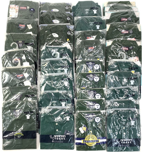 This lot includes 57 units of New with Tags Boy's Assorted Polo Shirts in Dark Green Colour and Assorted Sizes. Sizes included are 4, 5, 6, 7, 8, 10, 12, 14, 16 ,18 & 20 . Brands included: French Toast, School Uniform.