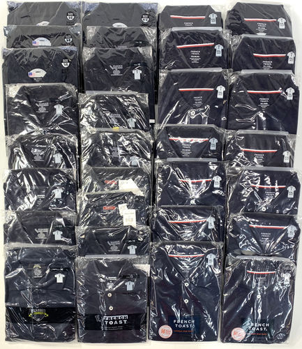 This lot includes 59 units of New with Tags Boy's Assorted Polo Shirts in Navy Blue Colour and Assorted Sizes. Sizes included are 10, 12, 14, 16 ,18 & 20 . Brands included: French Toast, School Uniform.