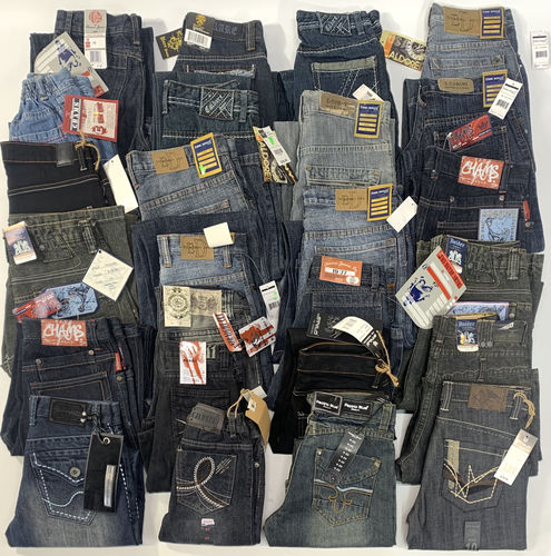This lot includes 25 units of New with Tags Boy's Assorted Fashion Denim Jeans. Assorted Brands, Sizes and Washes. See the manifest for sizes breakdown.