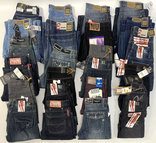 This lot includes 25 units of New with Tags Boy's Assorted Fashion Denim Jeans. Assorted Brands, Sizes and Washes. See the manifest for sizes breakdown.
