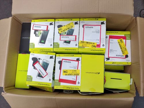 This lot contains 35 units of Bracketron Car Holder/Charger for Mobile Phones Silver/Black and more. These are uninspected customer returns and sold as-is. All of our customers returned inventory has not been inspected by our facility. Units may have return labels and/or stickers. As customer returns, there is no guarantee regarding functionality. All of the items have the original retail box. See the manifest for products breakdown.