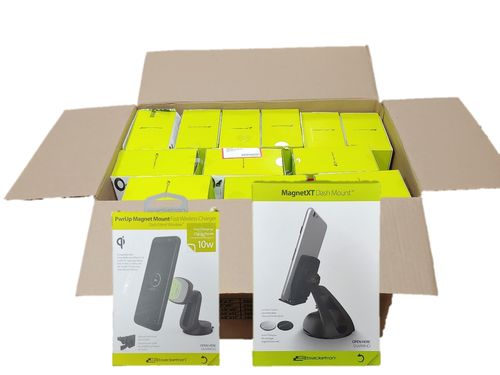 This lot contains 40 units of Bracketron MagnetXT Dash Mount for Most Smartphones and more. These are uninspected customer returns and sold as-is. All of our customers returned inventory has not been inspected by our facility. Units may have return labels and/or stickers. As customer returns, there is no guarantee regarding functionality. All of the items have the original retail box. See the manifest for products breakdown.