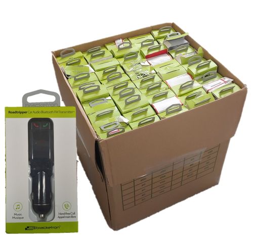 This lot contains 150 units of Bracketron Roadtripper Car Audio Bluetooth FM Transmitter Black. These are uninspected customer returns and sold as-is. All of our customers returned inventory has not been inspected by our facility. Units may have return labels and/or stickers. As customer returns, there is no guarantee regarding functionality. All of the items have the original retail box.