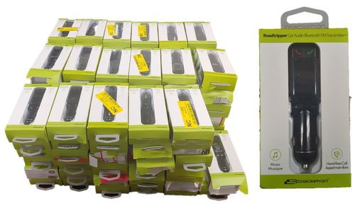 This lot contains 104 units of Bracketron Roadtripper Car Audio Bluetooth FM Transmitters in Black Colour. These are uninspected customer returns and sold as is. All of our customers returned inventory has not been inspected by our facility. Units may have return labels and/or stickers. As customer returns, there is no guarantee regarding functionality. All of the items have the original retail box.