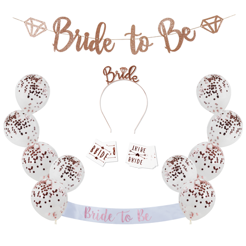 This lot includes 100 sets of Highly Decorative Bridal Shower Decorations and Accessories in Rose Gold Colour by Deco Station. Items Includes are Stainless Steel Bride Tiara, Confetti Balloons, Bride-To-Be Sash, Bride-To-Be Banner, and Bride Tribe Tattoos, all in Rose Gold Colour. Each set is retail ready, pre-packaged in a PC bag with suffocation labels attached, and brand new.