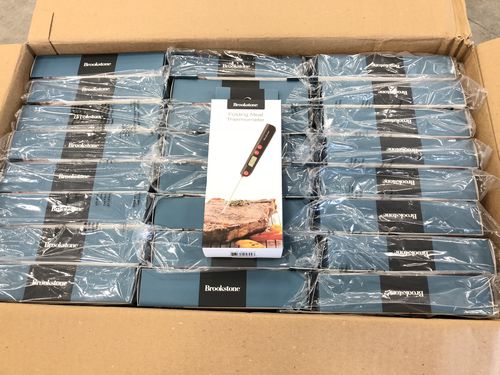 This lot includes 24 units of Folding Meat Thermometers With Digital Display by Brookstone. All items are brand new in packaging, and retail-ready.